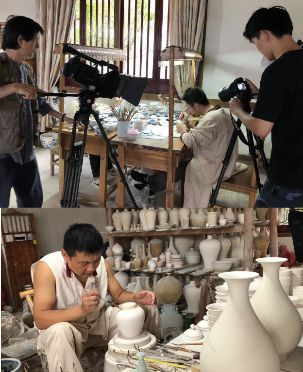 省电视台《赣风—景德镇瓷用毛笔》栏目来皇窑拍摄省级非遗传承记录片发表时间:2022-07-01 10:21 6月30日-7月1日,江西省文化厅与江西广播电视台联合推出江西省非物质文化遗产系列纪实片《赣风》于皇窑取景拍摄。该专题是以江西省已确立的省级以上非物质文化遗产为主要拍摄内容,并以寻访和纪实风格通过传承人以及物件的详实记录,为世人展示出一幅具有浓厚历史沉淀和文化底蕴的中国传统文化画卷。 此次《赣风》栏目摄影组来到皇窑拍摄景德镇瓷用毛笔专题系列记录片,探访民间传人失落的技艺,追寻传统文化过往的印迹。